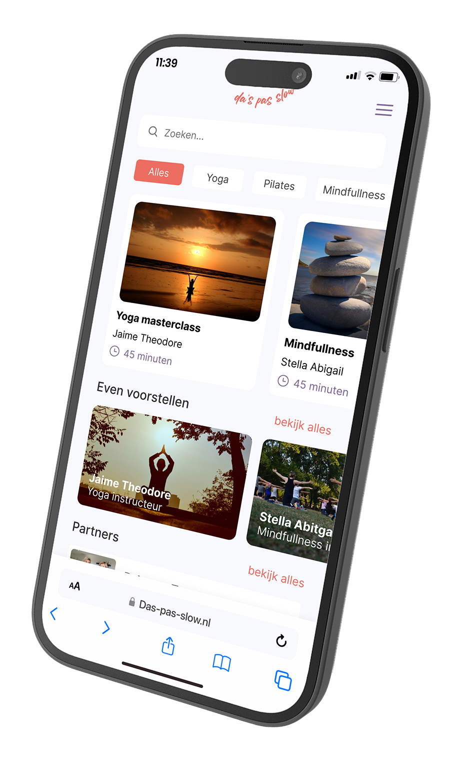 Vanaf het eerste moment dat je de app opent, krijg je een voorproefje van wat het platform te bieden heeft. De homepagina toont een selectie gratis masterclasses die direct te bekijken zijn. Een tweede sectie stelt een aantal van die inspirators kort voor, zodat bezoekers meteen een gevoel krijgen bij de mensen achter de content. Voor gasten die op dat moment op het park verblijven, is het mogelijk om in te loggen met de boeking gegevens vanuit Booking Experts.